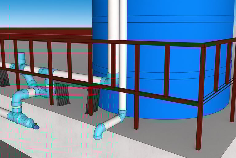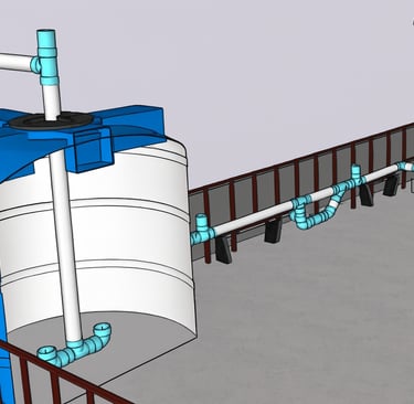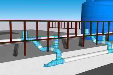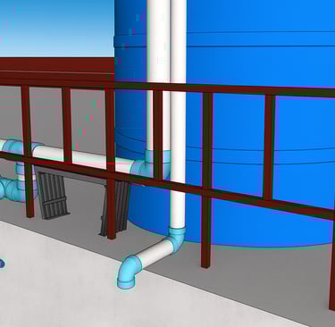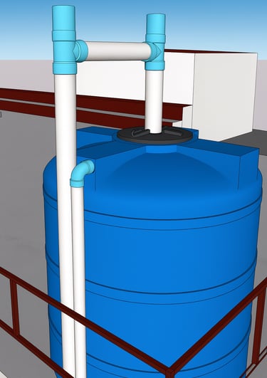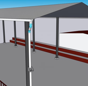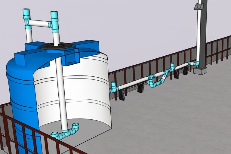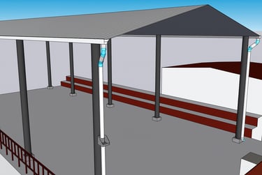 Línea de conducción: Compuesta por canaletas de lámina galvanizada, tuberías y accesorios de PVC que conducirán el agua de lluvia hasta su almacenamiento.